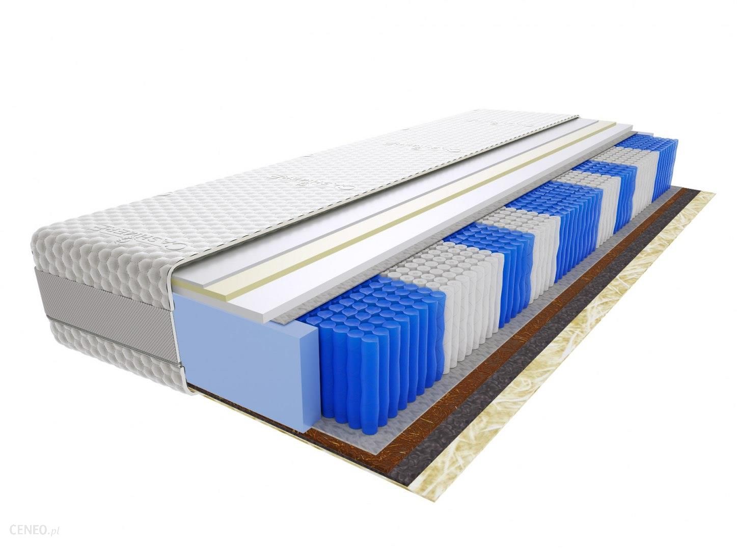 – wszystkie nasze materace zbudowane są ze sprężyn kieszeniowych. W przypadku sprężyn kieszeniowych multipocket ilość sprężyn ulega prawie podwojeniu – tutaj mamy 510szt/1m2. Taka ilość sprężyn to 2 razy więcej punktów podparcia naszego ciała. Jeszcze lepsza jakość snu oraz zwiększona żywotność materaca. Sprężyny kieszeniowe to zbiór pojedynczych sprężyn, każda z nich jest umieszczona w osobnym materiale, tzw. kieszeni. Dzięki temu nie słychać pracy sprężyn oraz wyeliminowany jest problem zsuwającej się osoby lżejszej na cięższą jak to ma miejsce w przypadku sprężyn bonellowych. Nasze materace posiadają 9 stref twardości zapewniając optymalne podparcie całego ciała. Miększe sprężyny stosowane w miejscu w którym nacisk ciała jest większy, np. w okolicach bioder. Twardsze sprężyny stosowane są w miejscach w których nacisk jest mniejszy jak np. odcinek lędźwiowy. Zainwestuj w materac klasy premium, który zagwarantuje zdrowy i wygodny wypoczynek.
